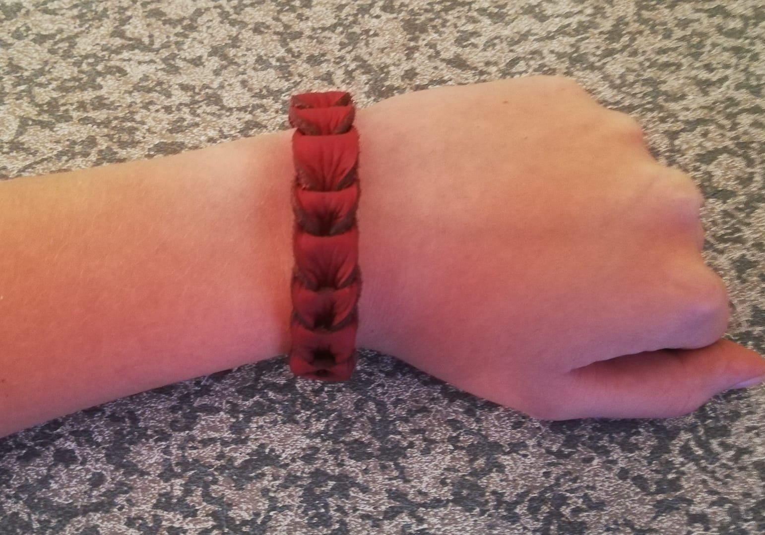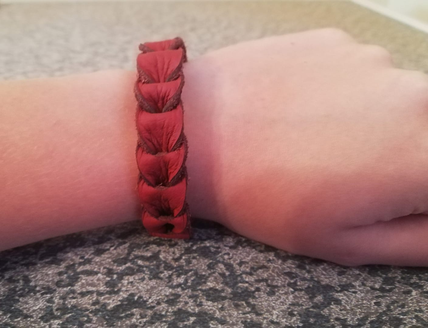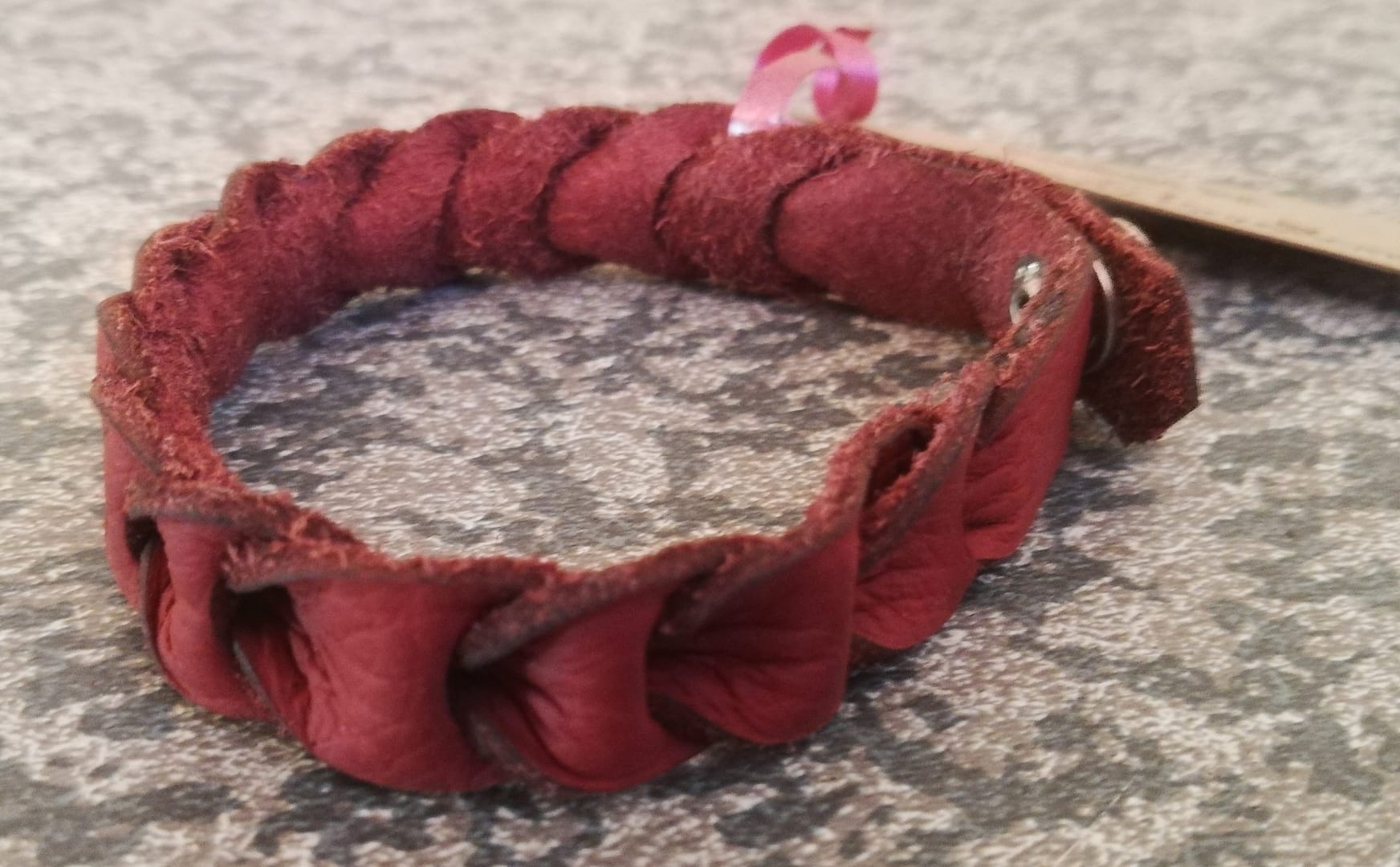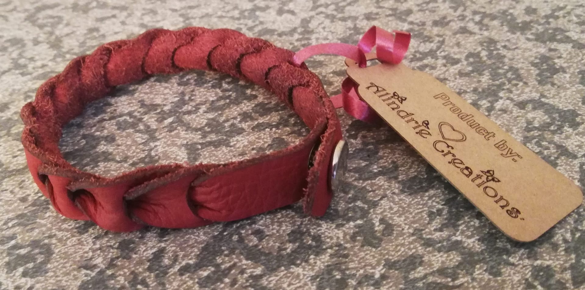 This genuine leather hand made bracelet is very sturdy but light weight, and made from a beautiful red leather.